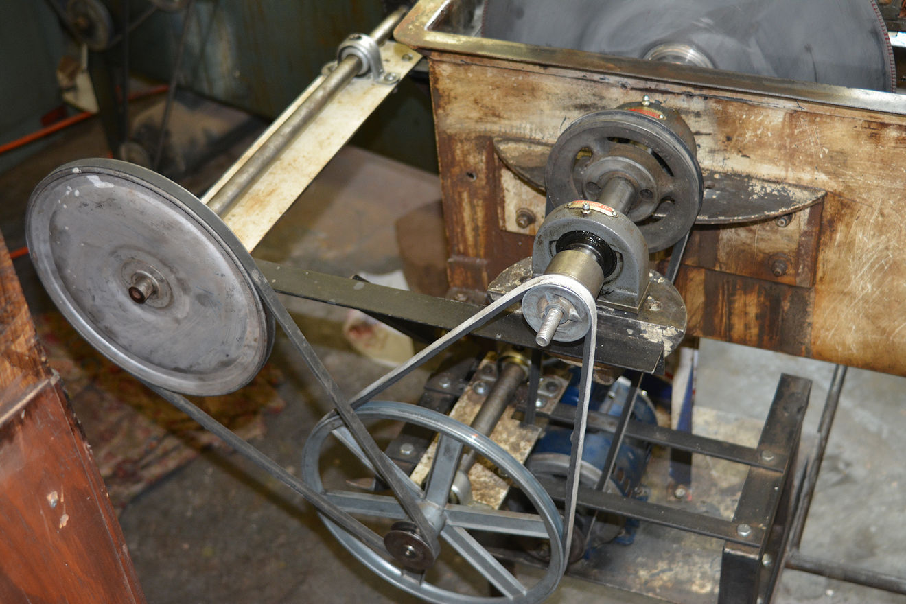 In the photo, you can see that the electric motor drives the main saw shaft, onto which is mounted an outboard small pulley driving a larger pulley on a jackshaft below, onto which is mounted a much smaller pulley driving a large pulley that drives the shaft at the top left of the photo. This shaft, in turn drives a worm gear reduction head that is just out of sight at the top center of the photo. The result of all of this speed reduction is that the saw blade is going 100 miles an hour, but the rock is advancing into the machine at one inch in 11 minutes!