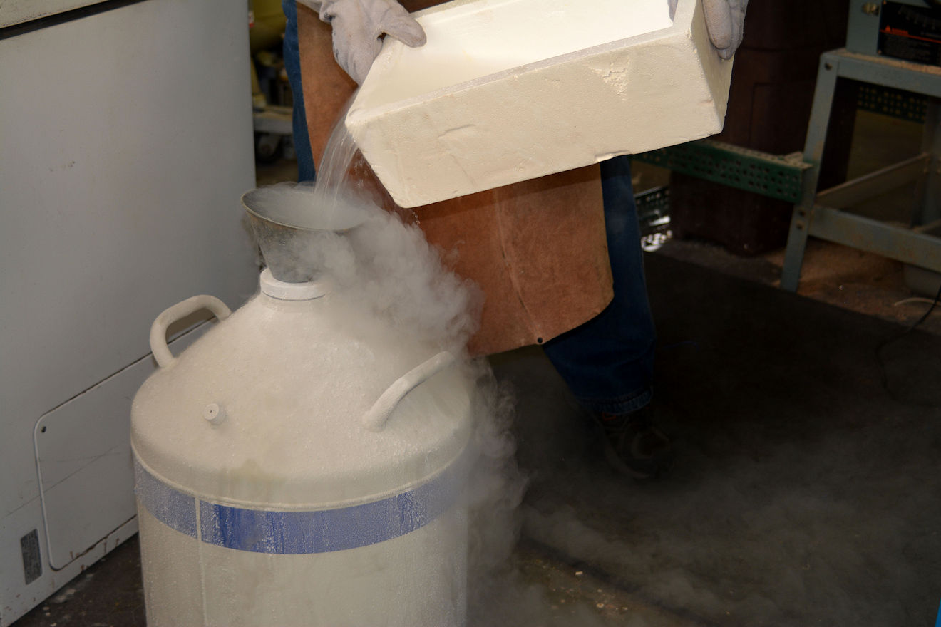 In this photo, I'm transferring liquid nitrogen from a thick Styrofoam box into a Dewar bottle. I do not use Styrofoam in the processing of the steel blades in any way; I was performing a post-treatment weight measure. The liquid nitrogen is poured from the actual aging container (not shown) into the Styrofoam which is placed on a scale to measure the weight, to determine how much was lost or used during the process. Weight is how liquid nitrogen is purchased, measured, and used, not by volume, but it's critical to know how much volume a pound of liquid nitrogen occupies. By the way, the liquid nitrogen is -325°F (-200°C).