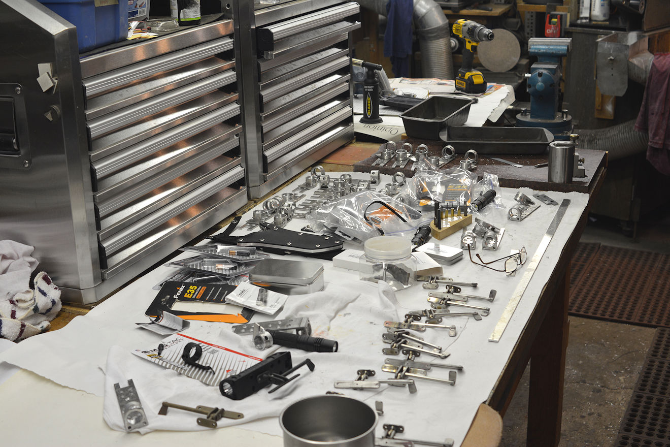 Many of the components stored are individually made. For instance, if my tooling is set up to make stainless steel clamping bars for my belt loop extenders, I'll make over twice what I need, and then I'll be ahead of the game on the next batch. The same goes for locking sheath mechanisms, retainer plates, spring pins, and horizontal and vertical strap clamps. I usually don't anodize these components until I'm actually completing the sheaths, since clients wishes and needs vary on the color. Coyote brown and black are the most common requests.