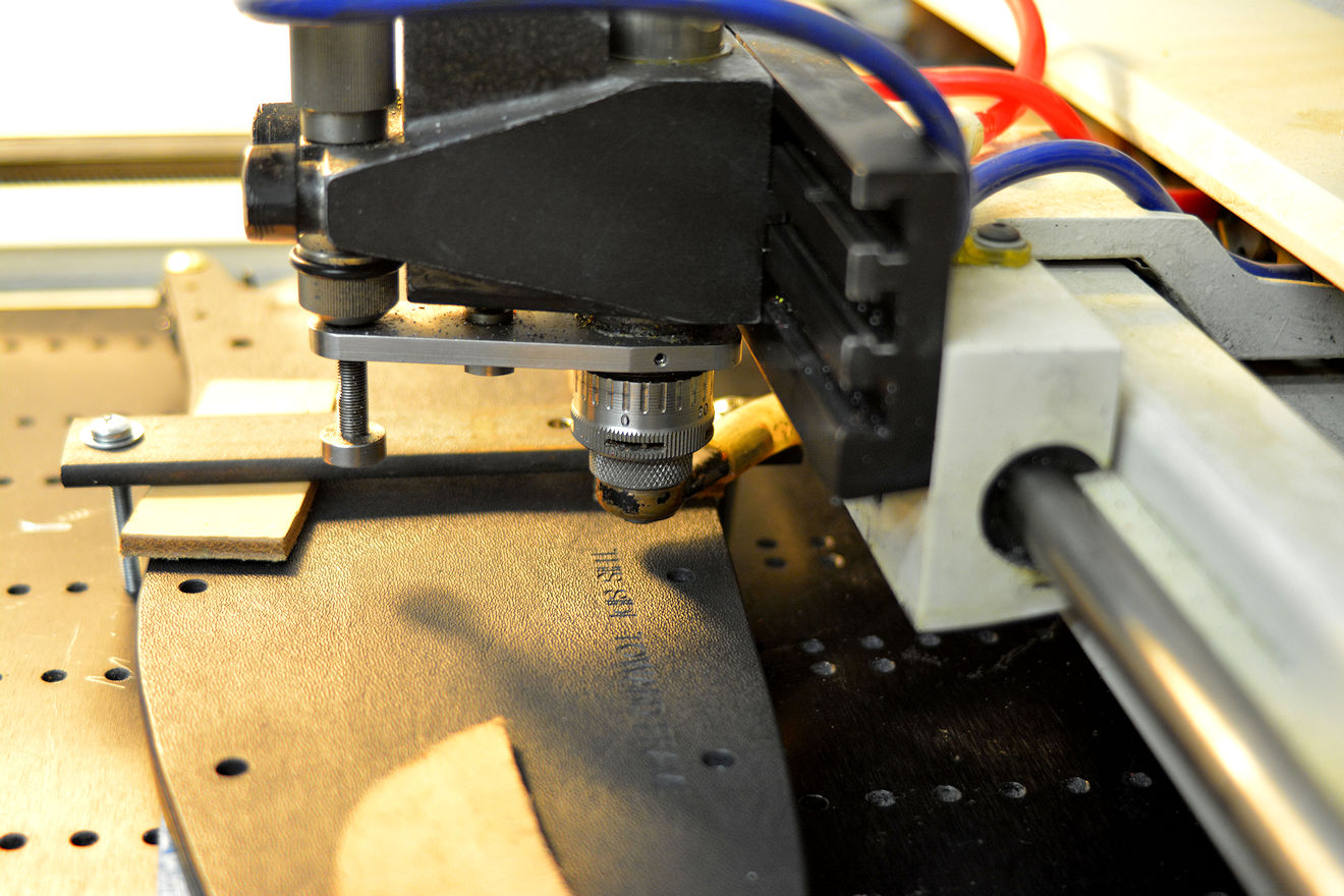 This is a photograph of the process of machine-engraving instructional text on a locking sheath back. The sheath is double thickness kydex over an aluminum frame and it's being held in the engraver while a high speed rotary cutter engraves the text permanently into the kydex. The text is: "This side toward frame," which designates the side of the sheath that faces the frame in my modular sheath frame and wear system, detailed on this "Ananke" and on this video.