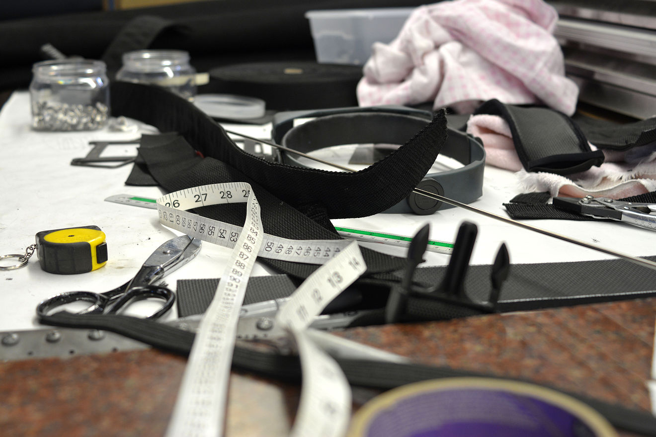 The photo is my main bench during the building process. You can see tape measures, both metal and cloth, webbing, shears, screw holders, parallel pliers, neoprene sleeves, magnifiers, blackened stainless steel frames, rules and hardware. In the very back, you can see rolled neoprene and ventilated web mesh rolls, with a roll of 2" black polyester webbing.