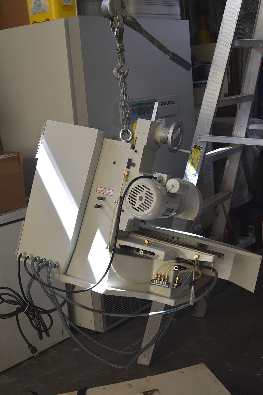 The lapidary saw is a simple machine, but has two functions that are wildly different. The first is to spin the blade at a fairly high rate of surface speed, in this case upwards of 5000 surface feet per minute. This saw has an 18" diameter blade, and you can see it resting in the sump at the very top of the photo.