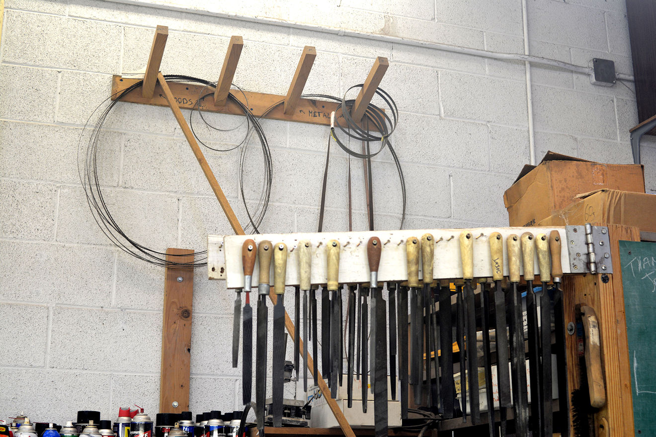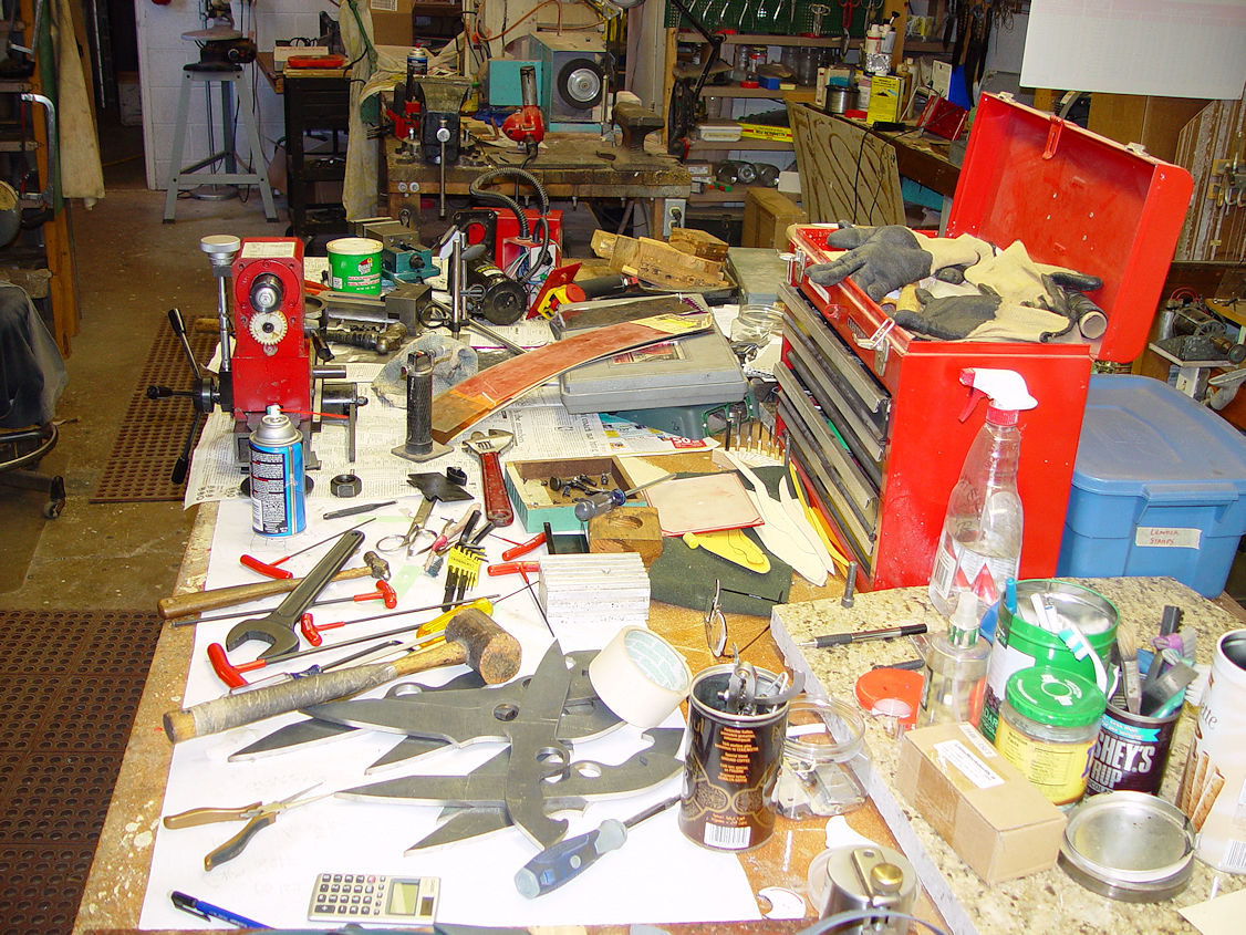 From my perspective, a knifemaker is not a simple worker; he's a technician, a craftsman, and, above all, an artist. If it's simple repetitive tasks that are performed, one might as well set up and program a machine to do them, for the human factor is not necessary. The shop then becomes the studio, where all is seen through the eyes of the artist and creator, including every piece of equipment, rack of storage, or station for dedicated tasks.