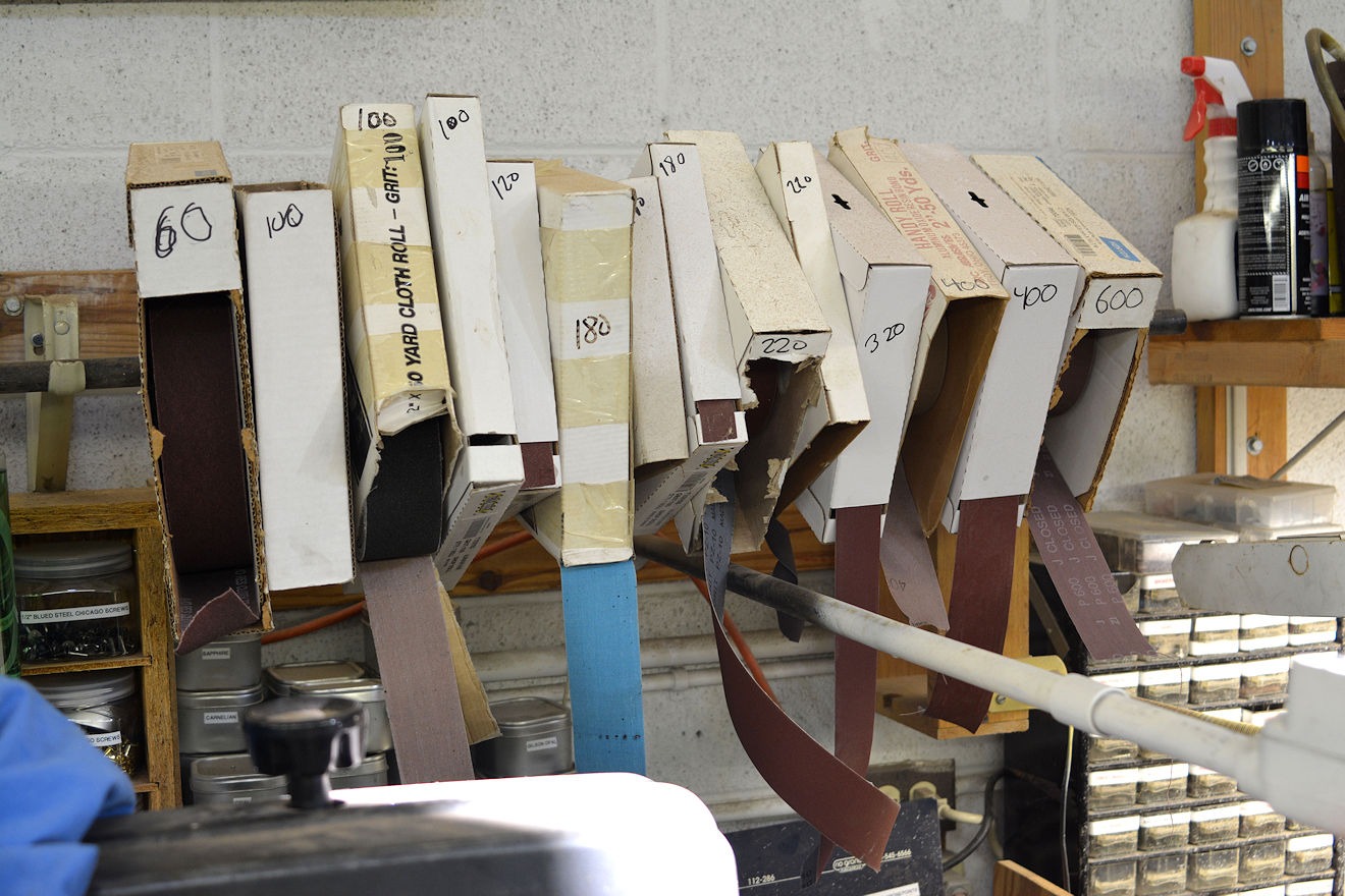 You can see many different grades of abrasive sheet on the rack. The typical grit sizes are 36, 40, 60, 80, 100, 120, 180, 220, 240, 320, 360, 400, 600, 800, 1000, 1200, and 2000 grit. Finer than the 2000 grit is crocus cloth, an iron oxide backed on cloth.