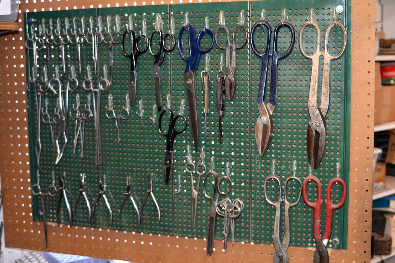 From left to right: small, tiny, and accurate scissors for exotic skin inlays and fine paper patterns, hemostats and forceps, small flask clamps, towel clamps, sponge clamps, and piercing clamps (borrowed from the medical field). In the middle are textile scissors and scraping knives, and on the right are bulldog metal shears in various sizes. In the lower left are an assembly of bending and forming pliers.