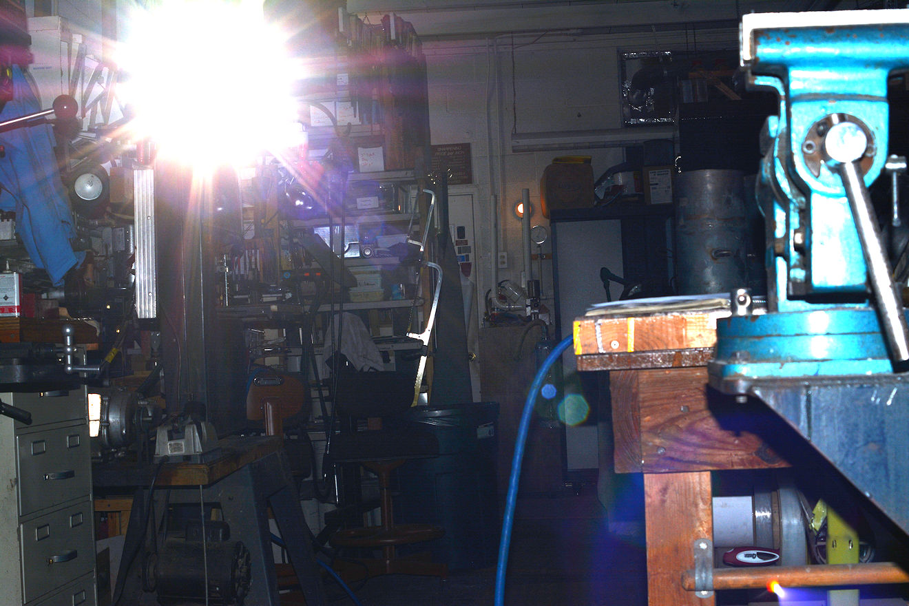 The predominant visual in this photo (apart from the sun's flare) is the Larin vise in the foreground. I have many vises, and there are great and endless uses for all of them. Most of them are made nowadays in China, and the Chinese are very good with cast iron. I have a multitude of different jaws, jigs, and clamping accessories for the vises, and the best ones swivel in every axis. Heavy vises should be mounted on heavy steel tables, and access to the work area around them are essential. This vise has aluminum block jaws to prevent marring on harder materials, and it also acts as a heat sink to pull away excess heat from aluminum and steel parts when forming them. You may be scratching your head at this ( a vise for a heat sink) but it makes perfect sense to me!