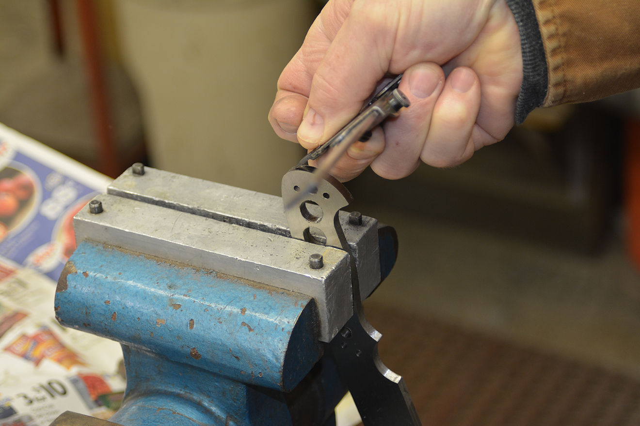After a blade is profiled, surface ground, and drilled, the edges are marked. There are various ways to do this, and a machinist set on high accuracy would use his granite plate and a height gauge to figure, set, and mark the edge of the blade. But this would require extensive deburring of the holes and flattening of the blade, and it's just not that necessary. Quicker is the simple tool shown here.