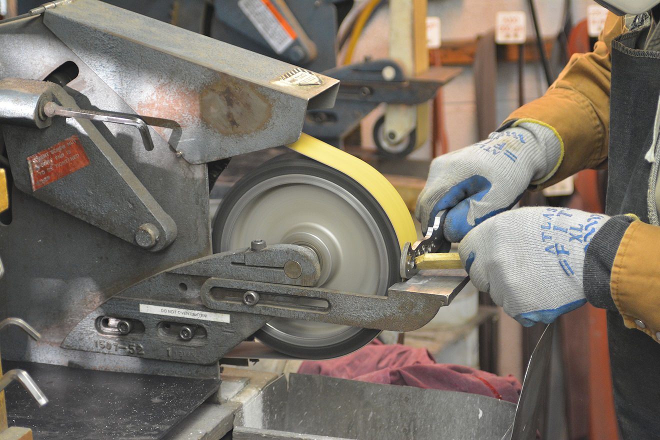 Tapering knife tangs starts after the weight relieving holes are drilled. The tang is held against a 60 grit ceramic abrasive belt, riding on an aggressive high-durometer serrated contact wheel, at a very high speed.