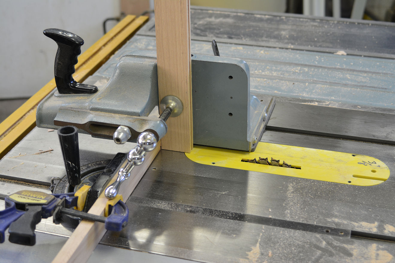 Wood work requires high accuracy. Nothing in wood is stronger than a properly cut joint, and nothing is weaker than an improperly cut joint. Careful attention to distance, placement, depth, and clearance means interesting setups, like this one where I'm setting the absolute clearance and position of the stock with a hard maple block clamped to the miter gauge for accurate repeatability. I make stands, cases, forms, tooling, and even things that might not be considered part of knifemaking with this critical part of the woodworking shop and studio.