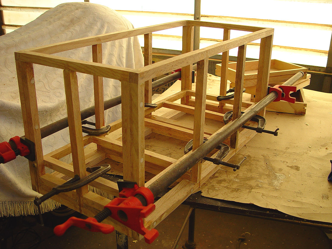 You can see the three drawers in the background, and the frame members clamped and glued with c-clamps and pony clamps.