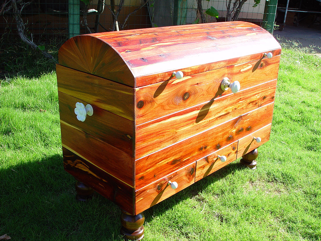 Here's the chest after lining it inside and outside with American Red Cedar. Red cedar is used because it has high resistance to insects and natural oils and repellants that make it smell wonderful. I used porcelain and steel handles and made turned heavy feet. This was a fun project and completely unique.
