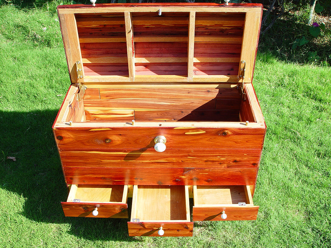 Here's the interior of the cedar chest. I made a special lock mechanism with a hidden release, and there are heavy metal pins securing the drawers when the lid is closed.