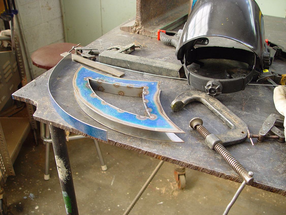 The form is being tacked together. A series of small welds keep everything in place when I follow with thorough and complete edge and seam welding. It always takes a bunch of clamps and stock pieces and scrap and jig setups to get it done right. After the piece is completely welded, I'll grind, sand, and finish the work to fit the project.