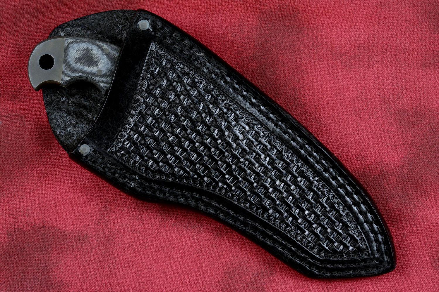locking sheath upside down across sternum, handle down, in black polypropylene,