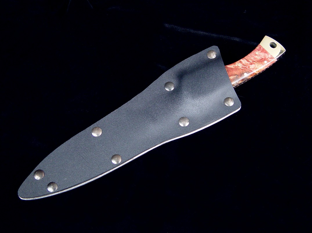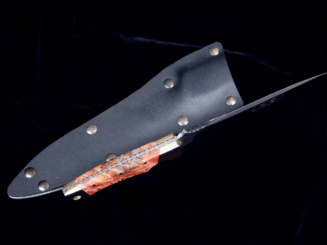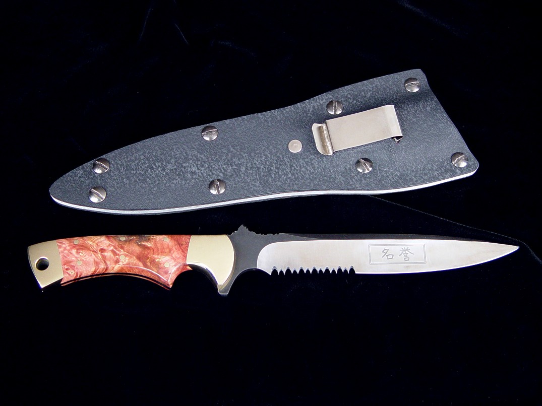 An older and early work, this is a special hybrid knife for a Military Police SWAT team member with my Patriot style blade married to my Golden Eagle style handle. This knife has a blued and satin finished blade custom etched with kanji. The blade is O1 high carbon tungsten-vanadium tool steel, with several inches of straight serrations, and has a fully tapered tang. The knife is bolstered in brass, dovetailed to bed a pair of stabilized Buckeye Burl handle scales. The sheath is a tension fit kydex, aluminum, and blued steel model with nickel plated steel boot/belt clip.