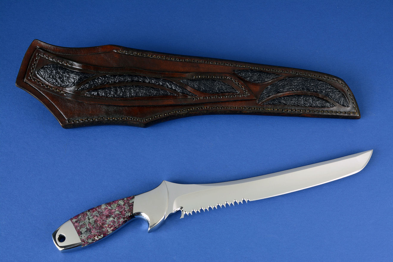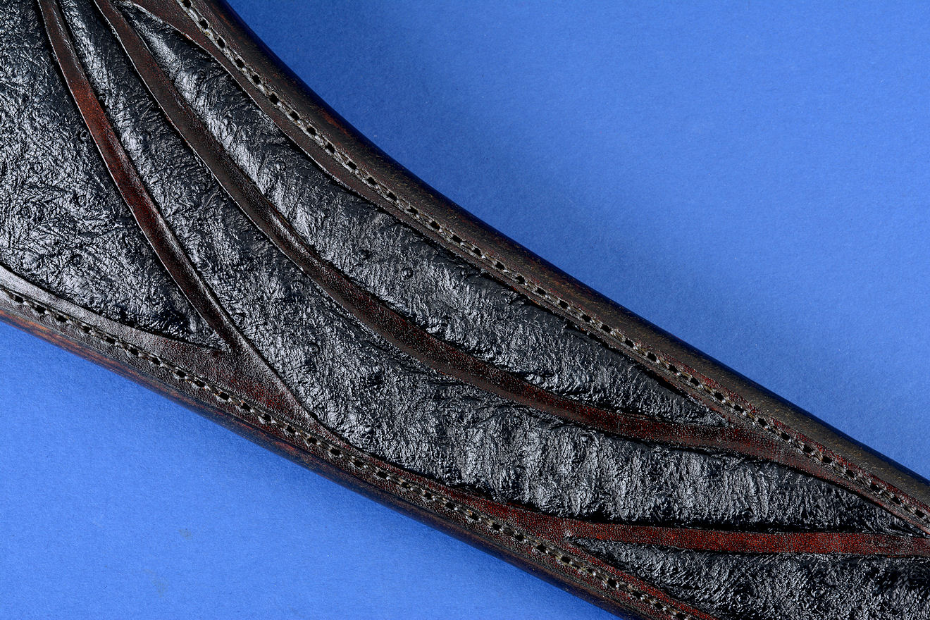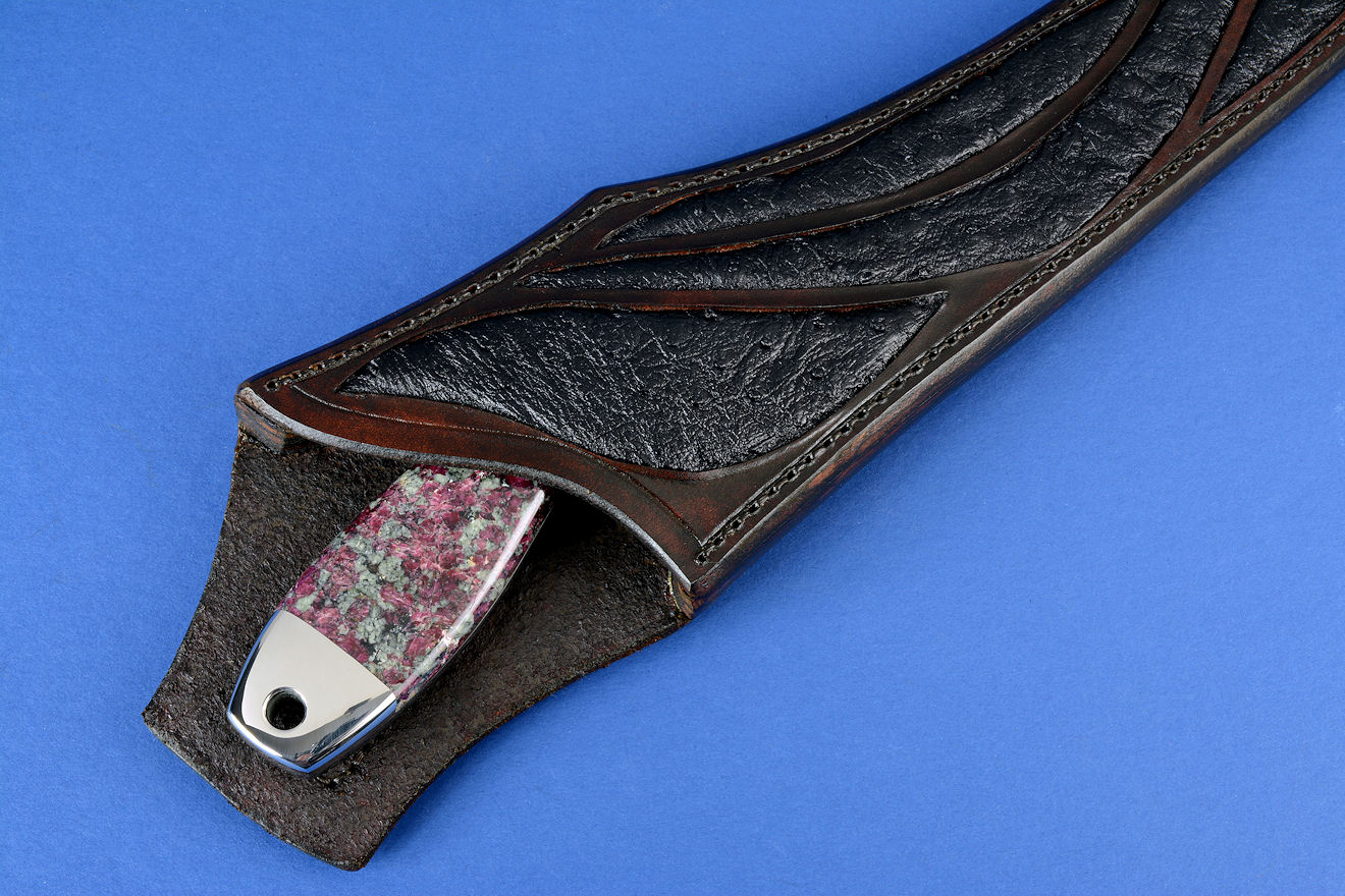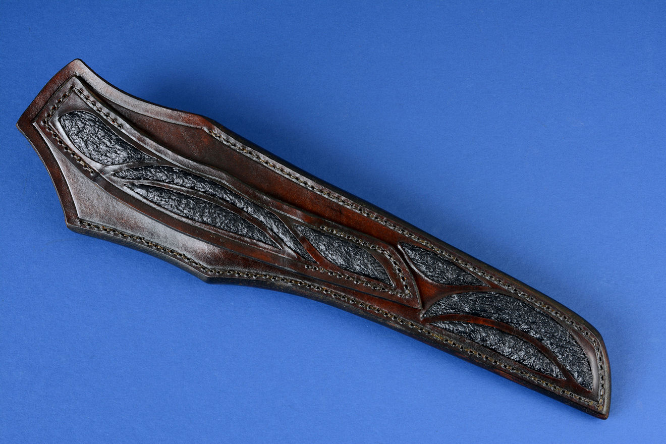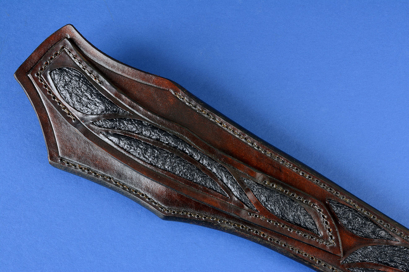- Sheath: Hand-carved leather, hand-dyed, inlaid with