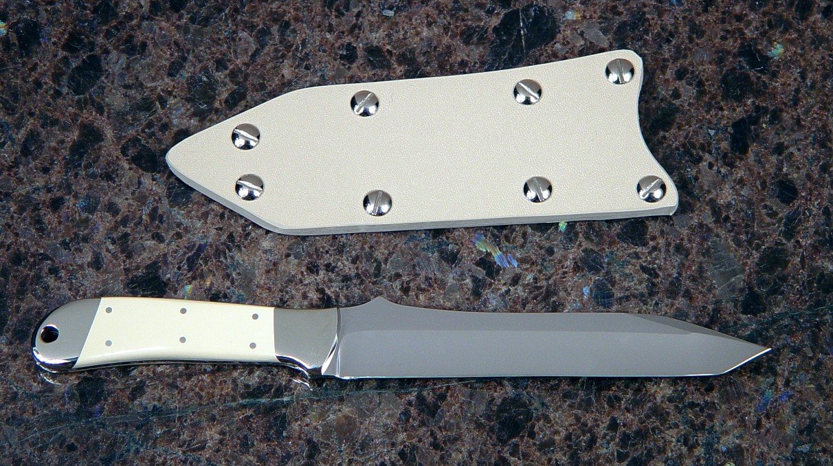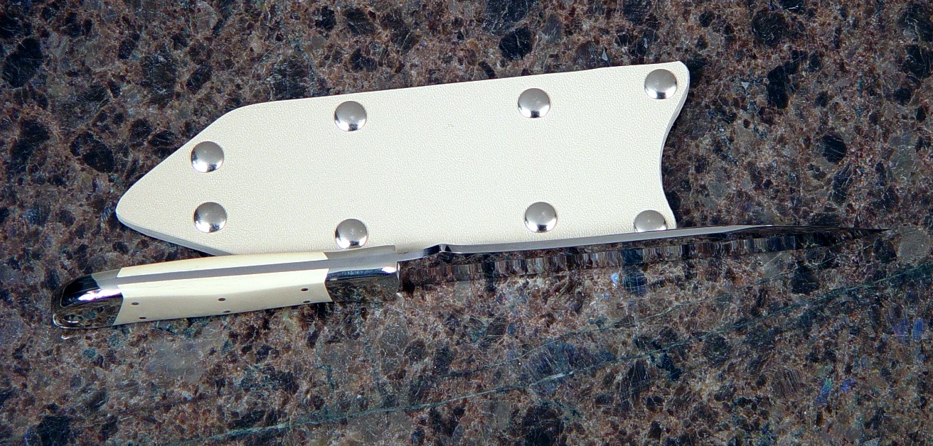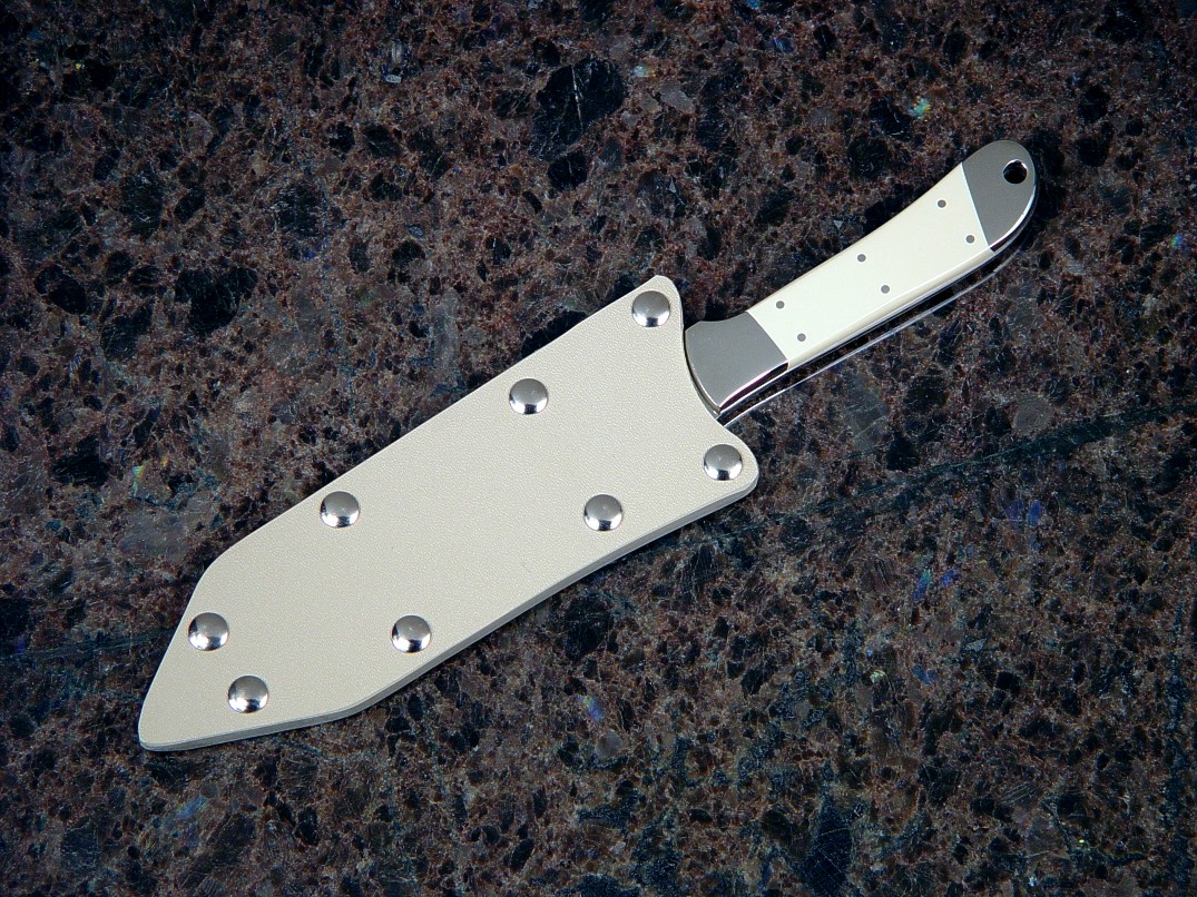 The Tharsis is a professional grade kitchen, chef's, and food prep knife in very thinly hollow ground 440C high chromium stainless steel for the highest corrosion resistance and great wear resistance, nickel silver polished bolsters, and ivory micarta phenolic handle scales for durability. This Tharsis is clean and smooth, and comes with a slip sheath for protection of double thickness kydex and nickel plated steel