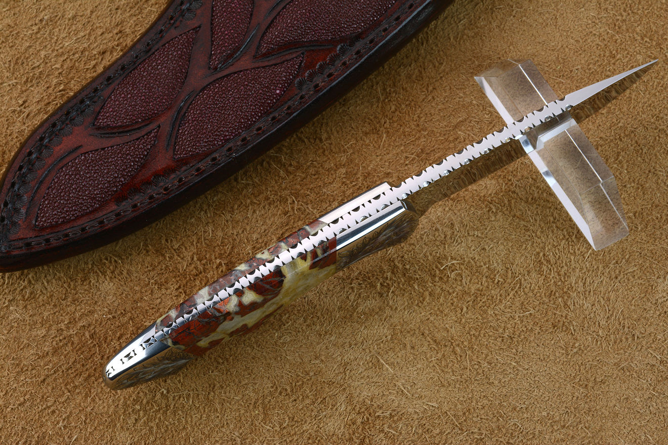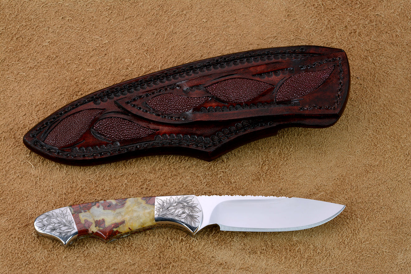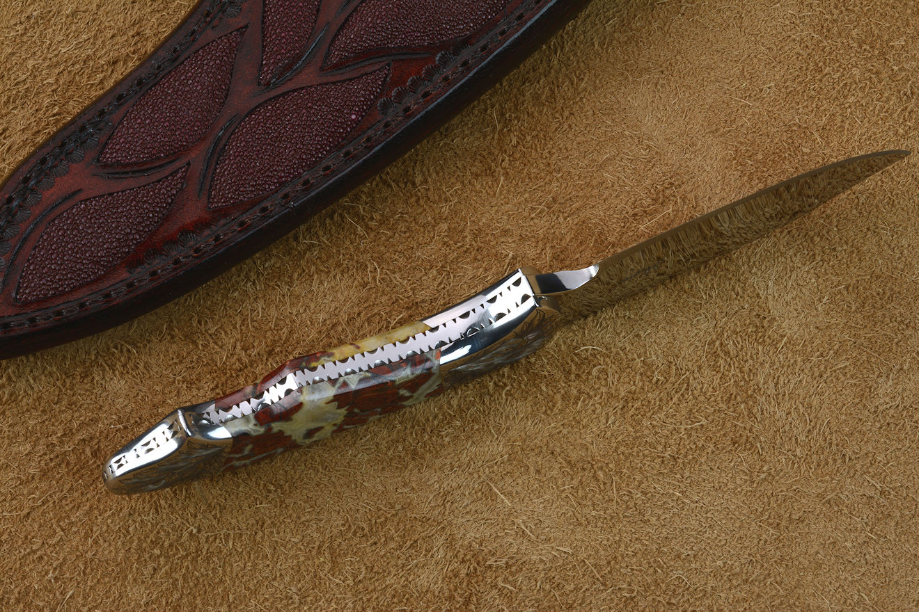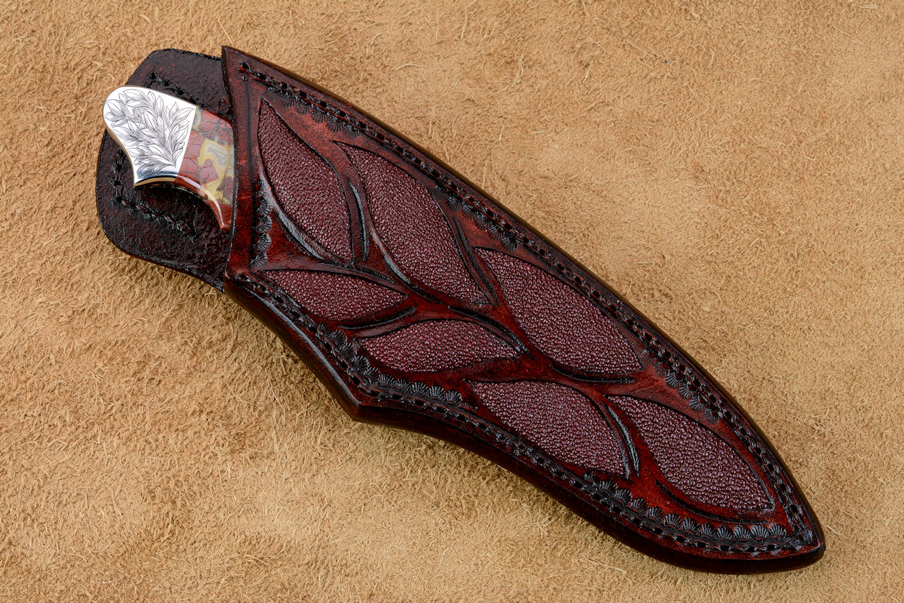 - Sheath: Hand-carved leather shoulder inlaid with Ray Skin