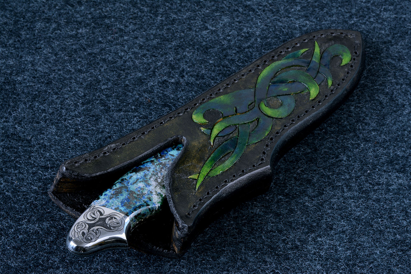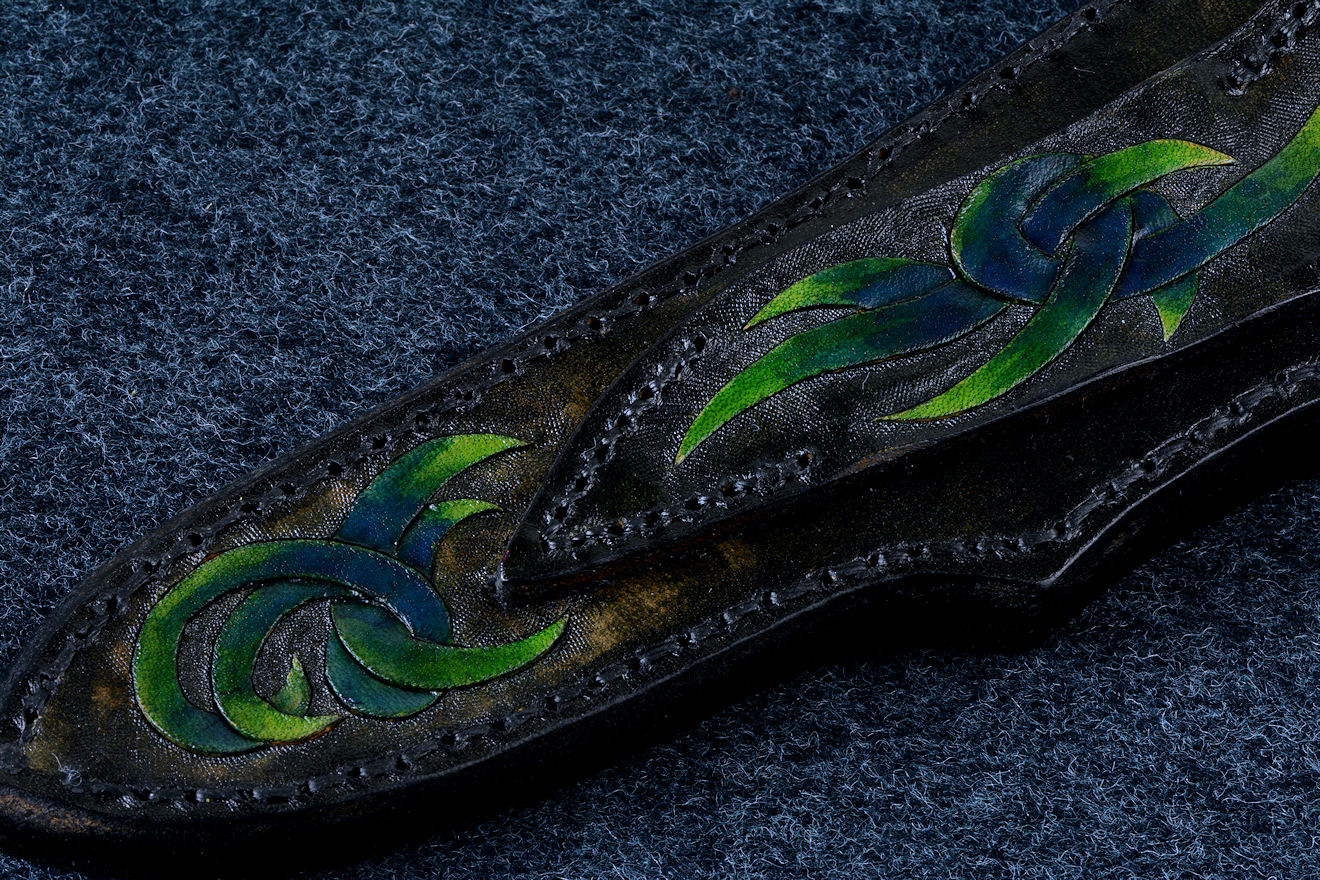 colored cuts in the leather. The sheath front, back, and belt loop are carved and dyed,