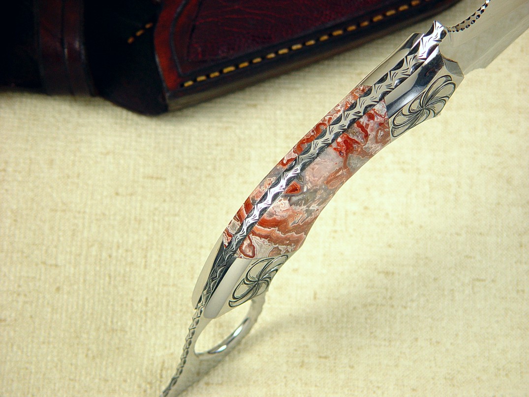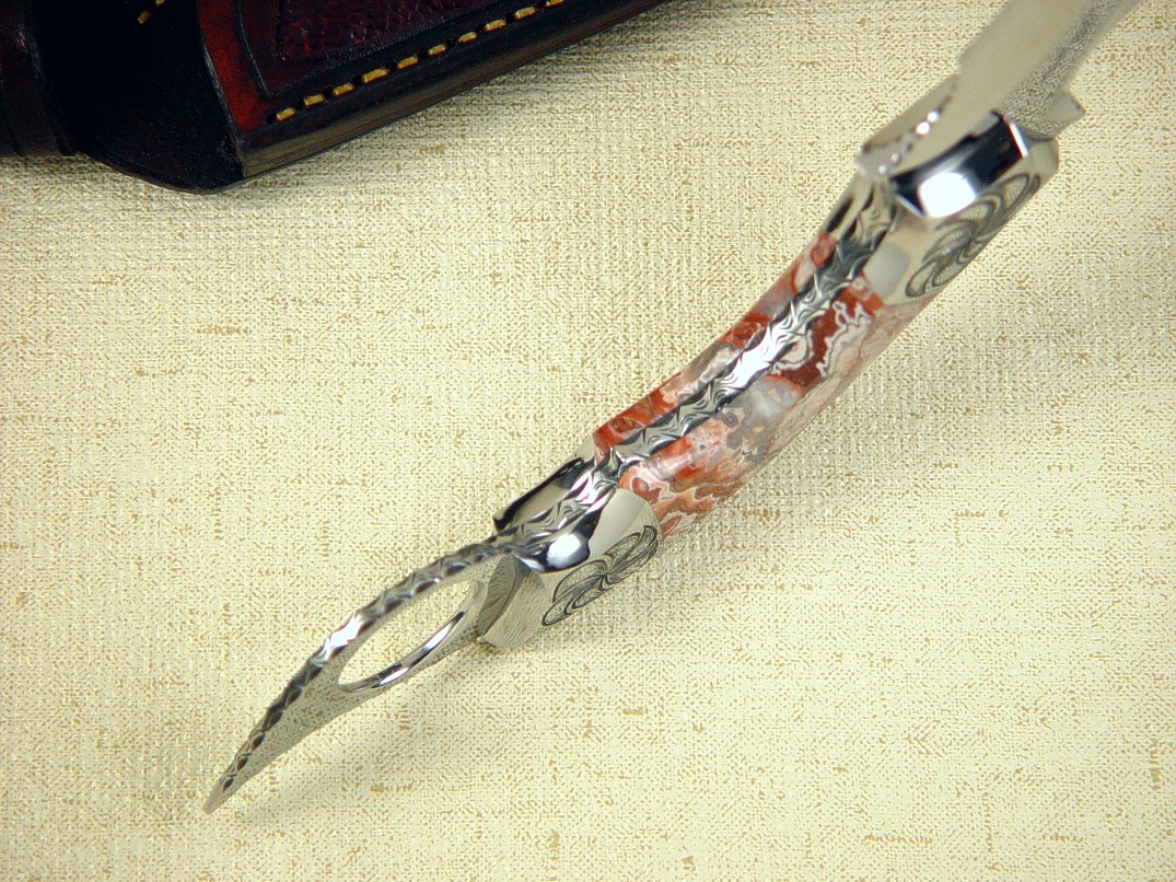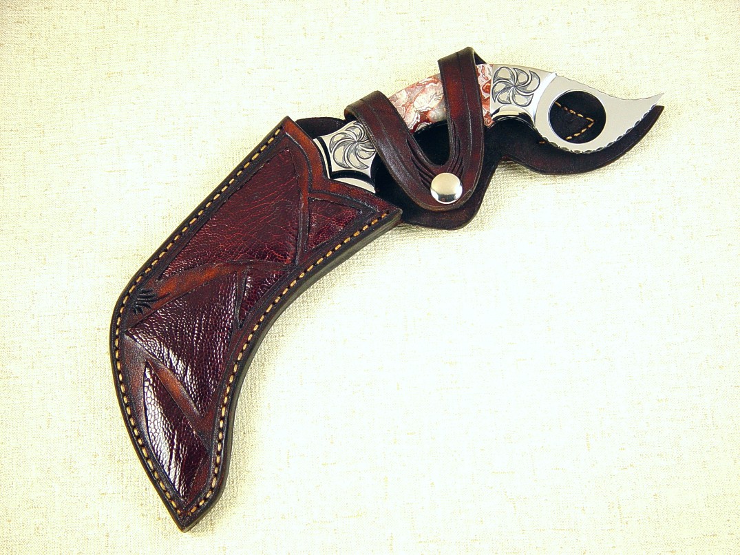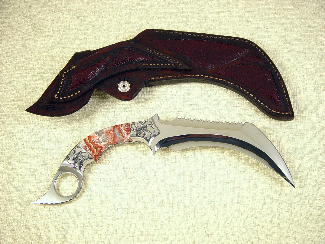 This striking and unusual Kerambit is a huge piece of edged art. With a 7 inch long blade, and a full length of over 11.25 inches, the Titan cuts an imposing figure. The knife is double edged, double hollow ground, and mirror finished 440C high chromium martensitic stainless steel for the highest corrosion resistance and brightest finish of any tool steel. The grinds are accomplished with a 3" diameter contact wheel, so they are very thin at the cutting edge while leaving plenty of 1/4" thick spine to support the knife blade. Of special importance is the concave hollow ground edge, something that is very rare in the knife world, both contemporary and in the past, because of the great difficulty in execution. The top straight edge has three inches of my Vampire rip teeth serrations, and the choils of both knives are deeply defined. The entire blade is fileworked and engraved, the tang is fully tapered for balance, and the knife tang has a rear finger ring, polished inside and out, with a persuader talon at the butt. The knife has 304 austenitic high nickel, high chromium stainless steel bolsters that are hand-engraved in a pattern that matches the curves of the blade and lines of the knife, and the handle scales are striking Crazy Lace Agate gemstone. The stone is very hard and glassy, the patterns within are intricate and detailed. The sheath has multiple inlays of burgundy Ostrich leg skin in 9 - 10 oz. leather shoulder, hand-stitched, in a design that allows a view of the handle with snap-strap retention. A magnificent Kerambit.