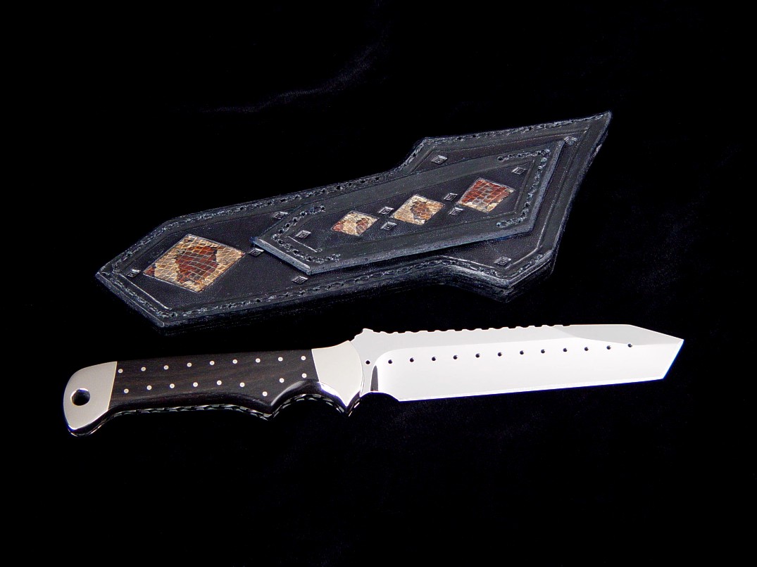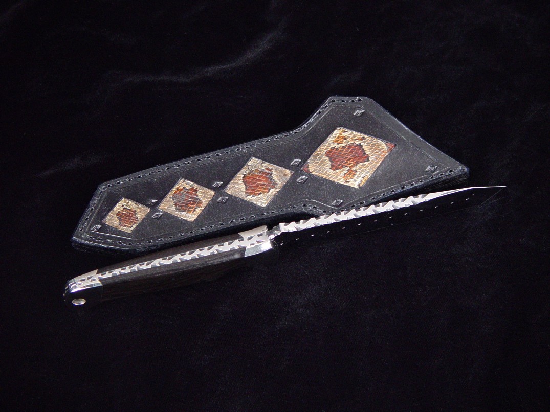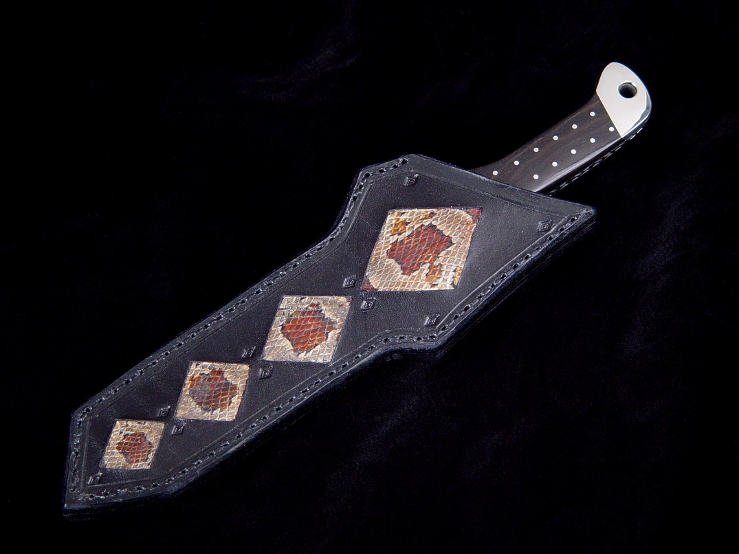 The sheath for this knife follows the angular and punchy design motif, and is hand-carved in heavy leather shoulder, dyed black and inlaid with Corn Snake skin panels accentuating the snake's squarish color pattern. The sheath is accented with small diamond shaped tooling, hand-stitched with black nylon, lacquered and sealed.