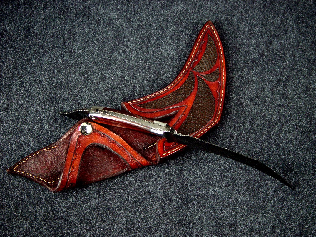 A striking Kerambit, Triton has a double edge. The steel is O-1 high carbon tungsten-vanadium tool steel blade, bead blasted and hot blued for a penetrating corrosion inhibiting surface. The blade has full filework, and has a fully tapered tang with a 1" rear finger hole and skull crusher persuader point at the butt. The blade has full 3" hollow grinds on both the convex and the concave sides of the blade, with a row of extremely sharp interrupted serration-edges I call "Barracuda." The deep choils on the blade terminate in substantial quillons to prevent the hand from sliding forward, and the handle accommodates either tactical or traditional grip style. The bolsters are carbon steel, and dovetailed to support a pair of beautiful heat treated Red Tiger eye Quartz gemstone handle scales, chatoyant with the "cat's eye" effect. The knife sheath is difficult to make in this type of knife, and this one is inlaid with Cape Buffalo skin in 9-10 oz. leather shoulder, made to protect the entire blade yet display the beautiful handle. The sheath is stitched with polyester sinew, dyed to match the handle, lacquered and sealed.