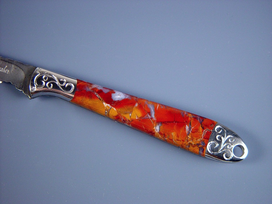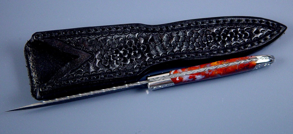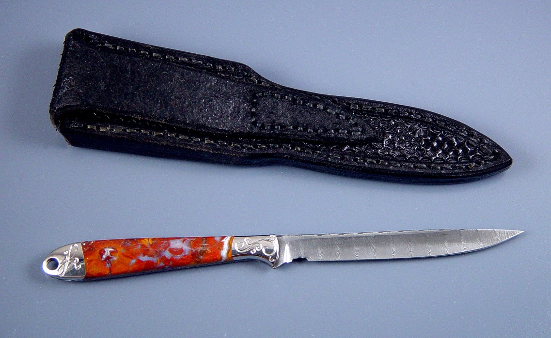 The Trophy is a small knife, originally designed for caping and fleshing in tight areas for game trophy hunting, thus the name. It also makes a great small utility knife. This older custom made model has a high and low carbon stainless steel damascus twist pattern welded blade, carefully and successively hollow ground and etched. I ground it with a tight 3" contact wheel to offer a very thin cutting edge while preserving and thicker and strong blade spine. The bolsters are dovetailed and simply engraved with the client's monogram, and made from high nickel, high chromium 304 austenitic stainless steel. The handle scales mounted on the fully tapered and fileworked knife blade tang are beautiful Polvadera Jasper gemstone, a very hard, tough and lustrous polished gem from New Mexico. The sheath is hand-stamped and tooled leather shoulder, dyed black.