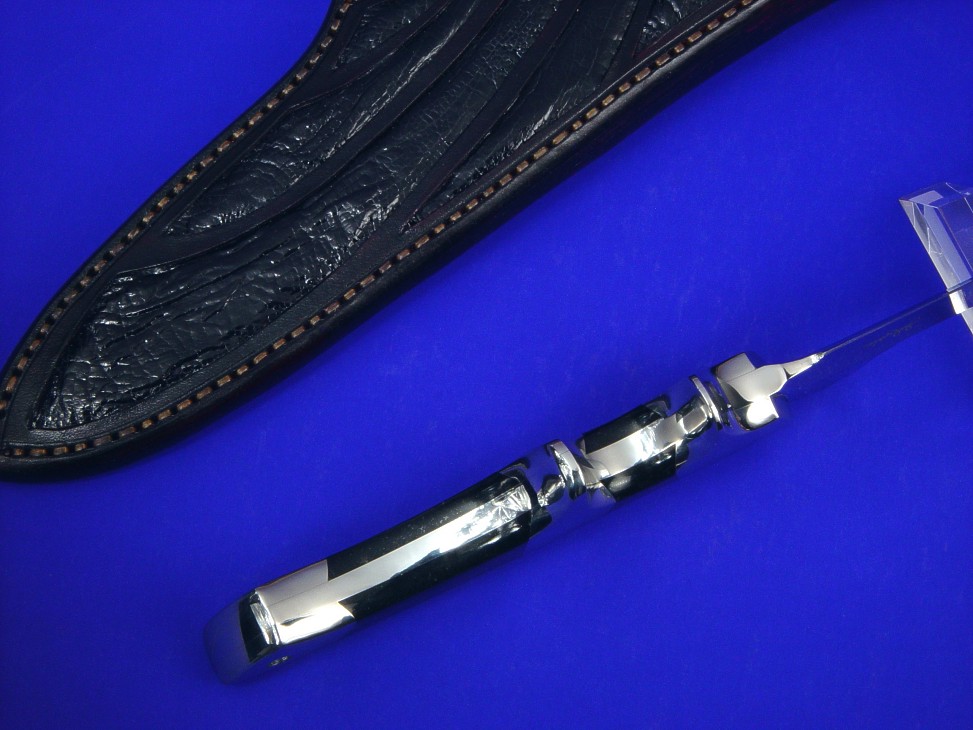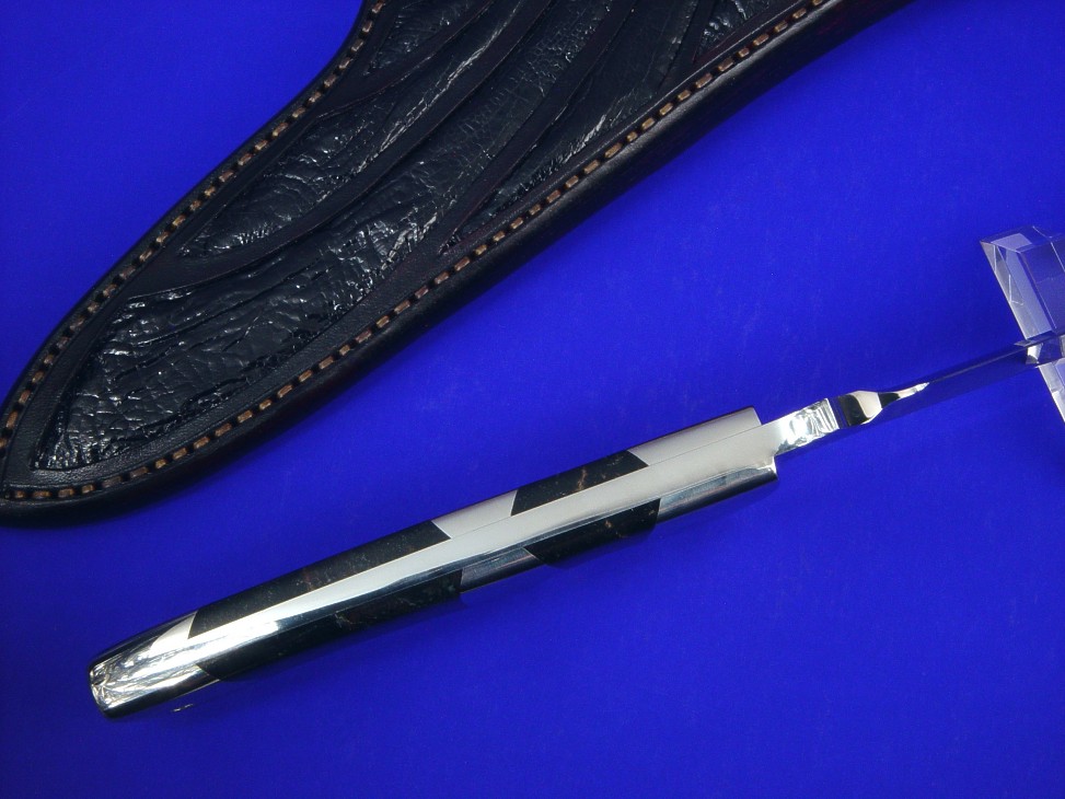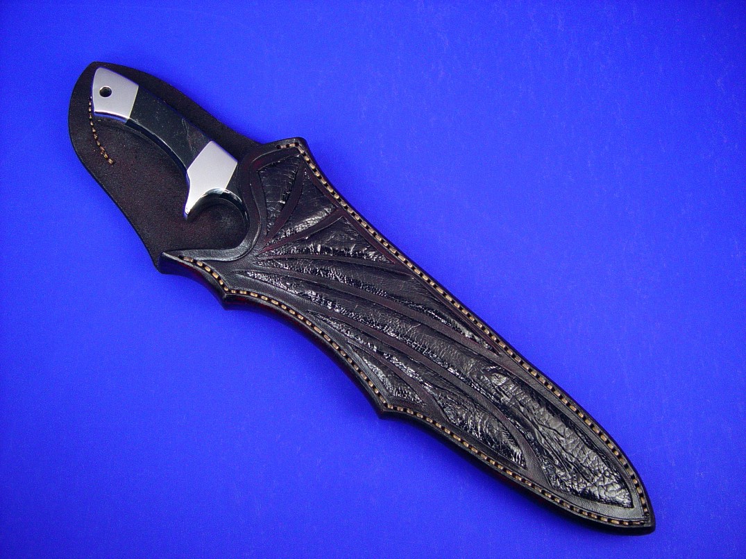- Sheath: Hand-carved leather inlaid with black glazed ostrich leg skin