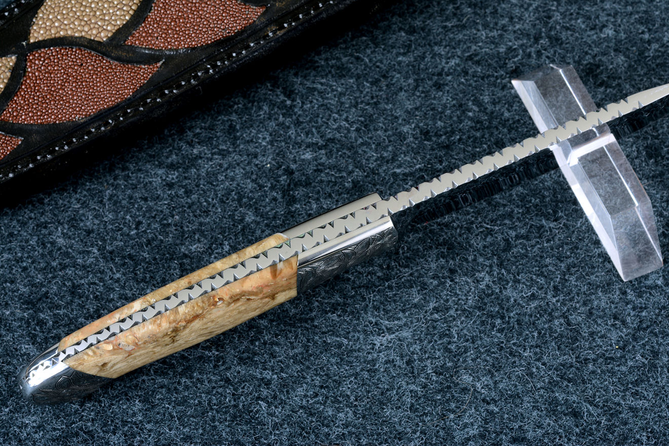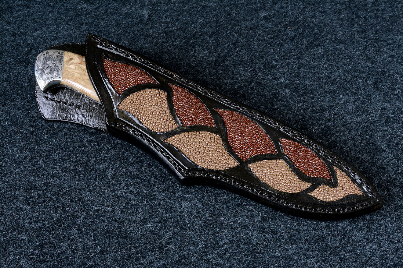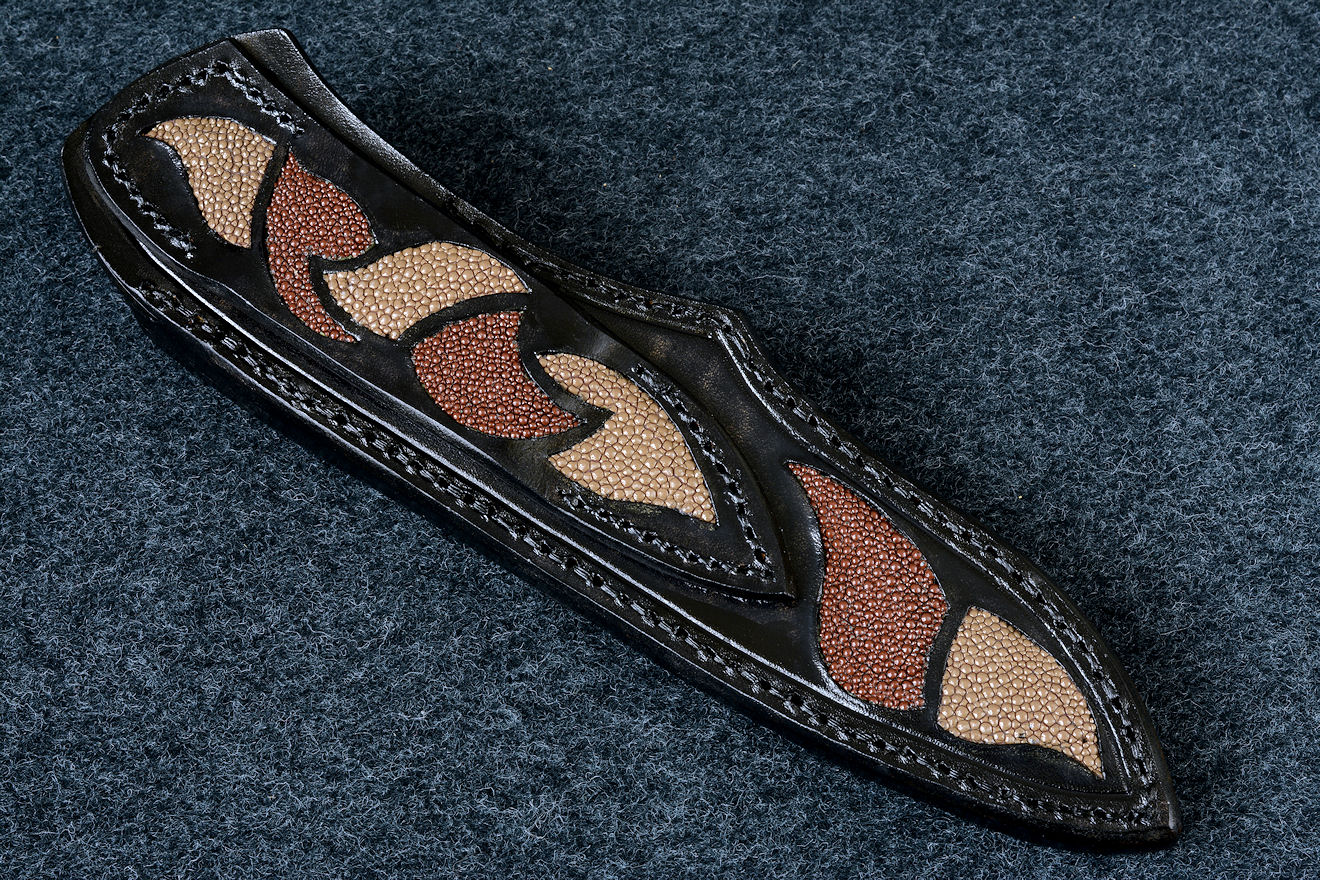 - Sheath: Hand-carved leather shoulder inlaid with ray skin