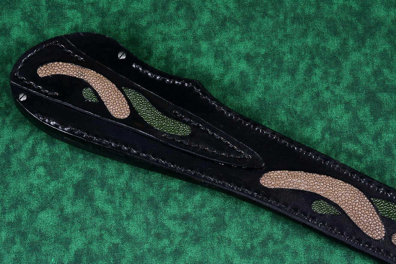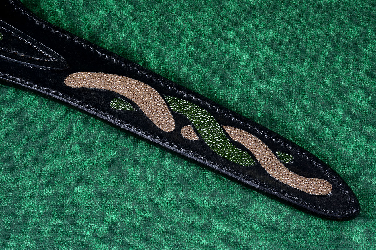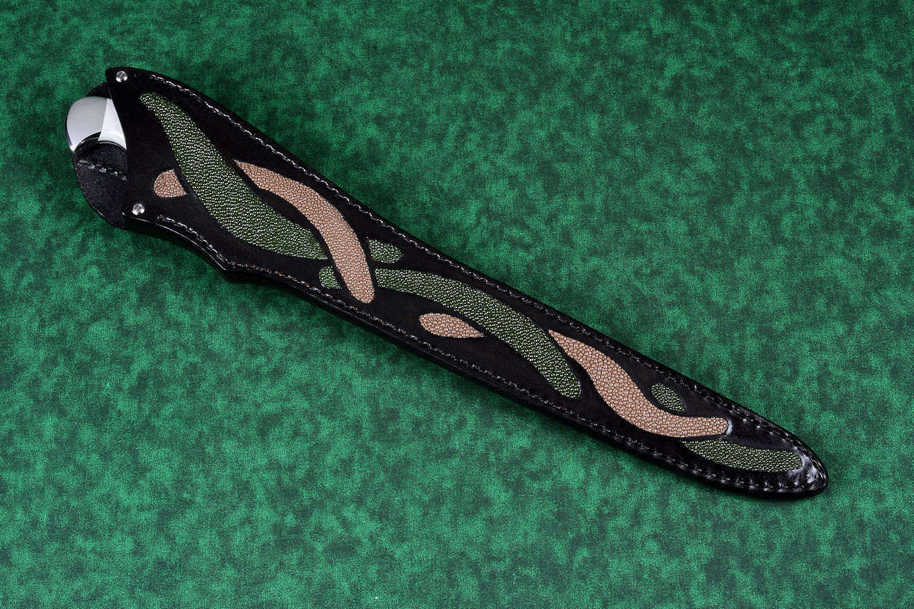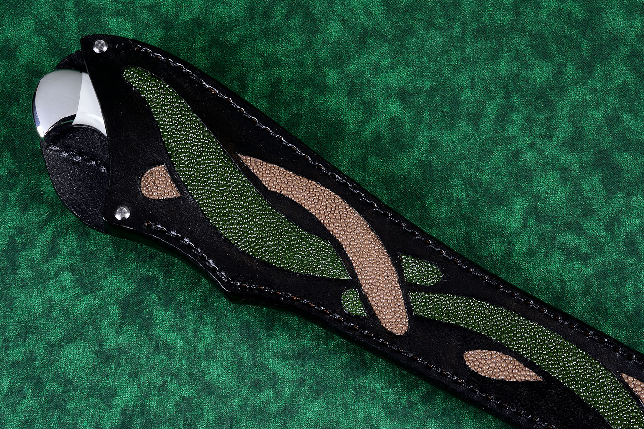 Sheath: Hand-carved, hand-dyed Leather Shoulder inlaid with green, tan ray skin, nylon stitching, stainless steel welt screws