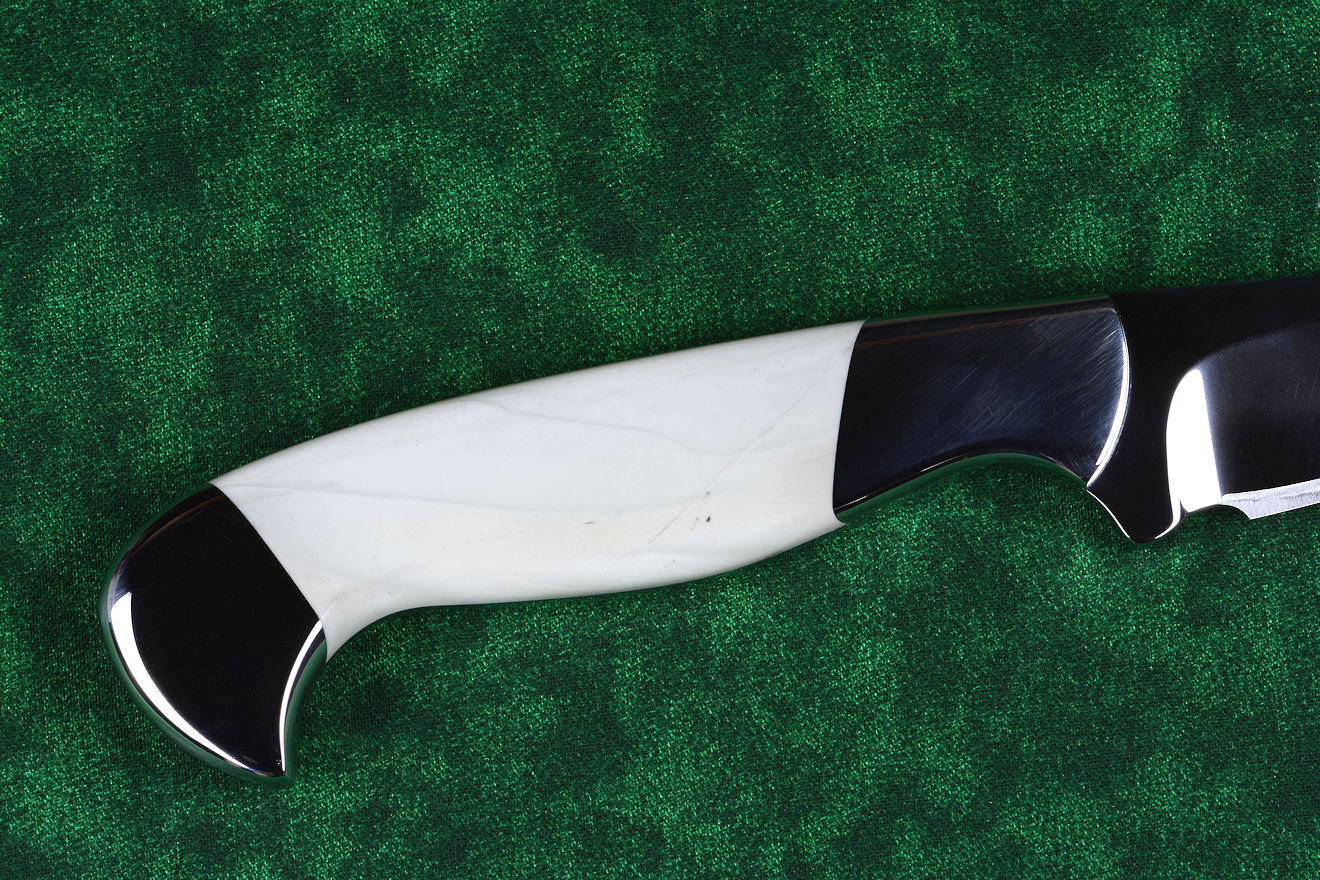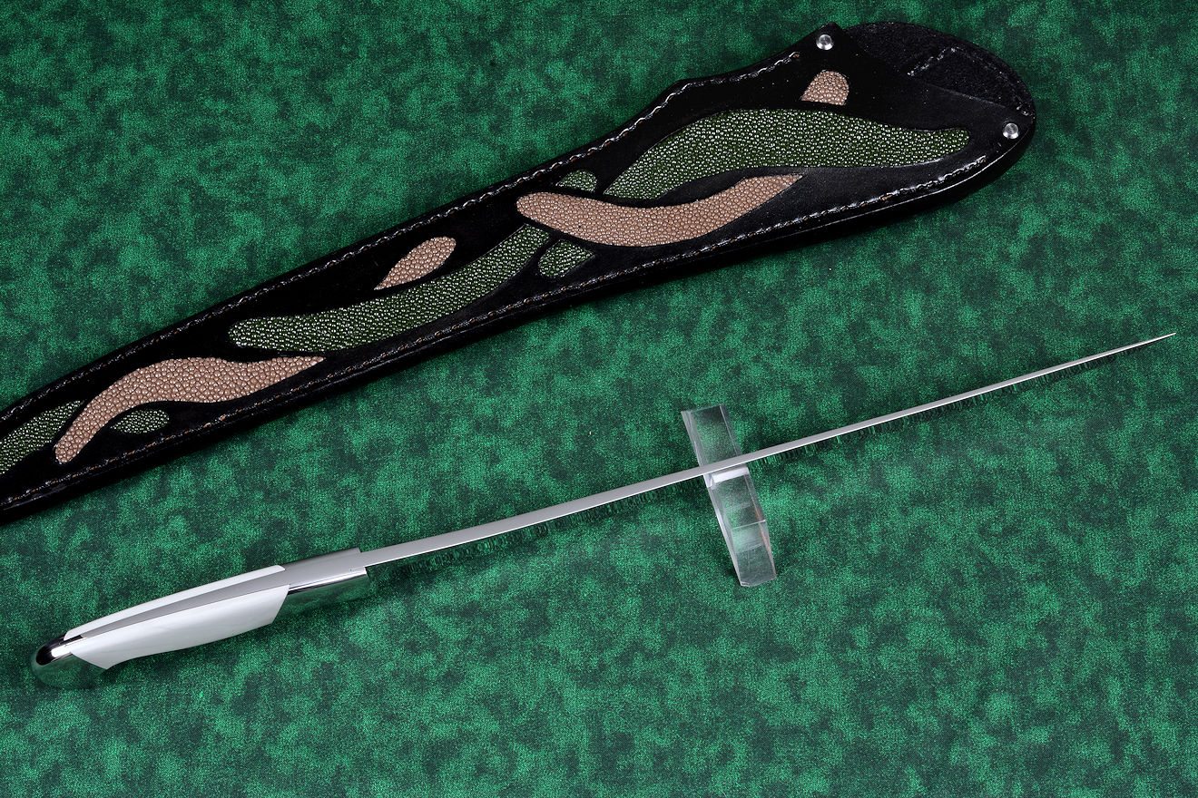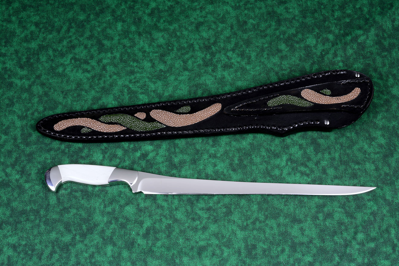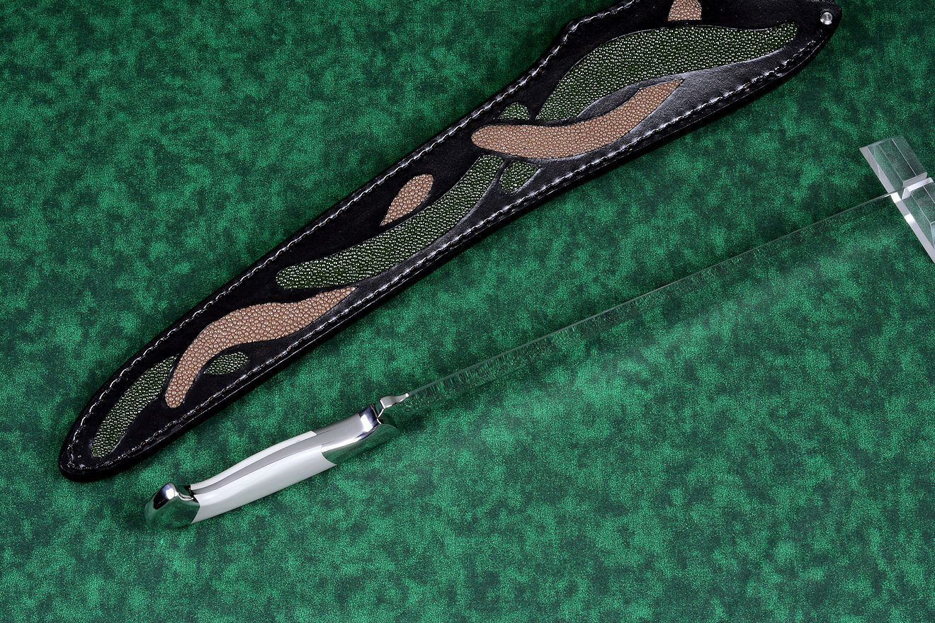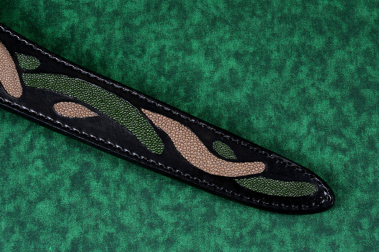 Sheath: Hand-carved, hand-dyed Leather Shoulder inlaid with green, tan ray skin, nylon stitching, stainless steel welt screws